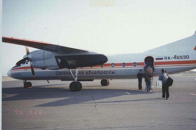 函館を4月28日の午後5時に飛び立ったアエロフロートのアントノフ24(32人乗り)には白人3人を含む28人が乗り込んでいた。晴れかけていた天気も出発の頃には再び曇り、風も出てきたので少し不安ではあったが、上空はほとんど揺れなかった。一面の雲海の中を飛び続けているため、今どこを飛んでいるのかも分からず、退屈しのぎに食事時に出されたレモンウオッカをお代わりして、少し酔ったかなと思っているうちにユジノサハリンスク空港に着いた。